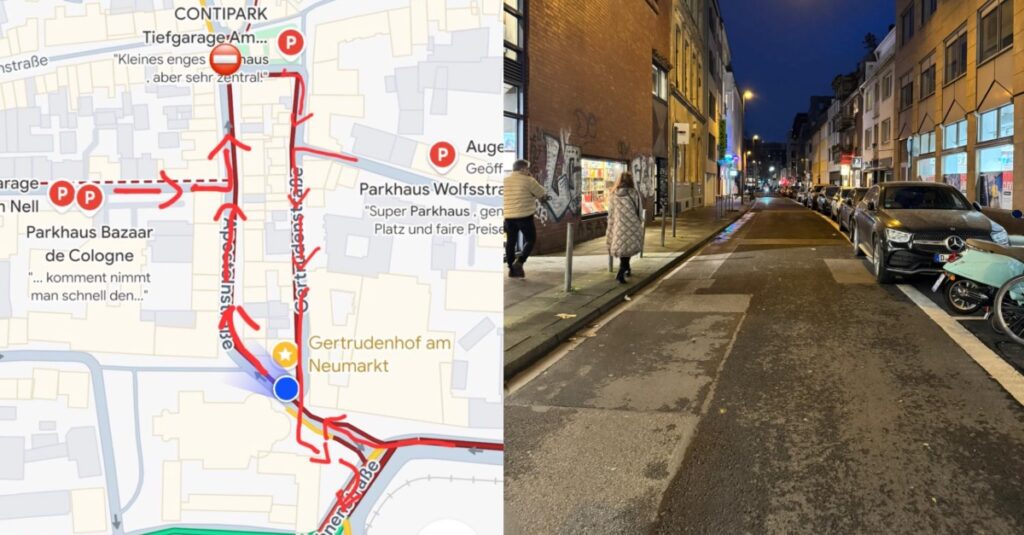 - Die Folge: Die Autos müssen an der Ecke Apostelnstraße / Ehrenstraße abbiegen und in der Einbahnstraße Gertrudenstraße wieder zurück in Richtung Neumarkt fahren – man fahrt quasi im Kreis.