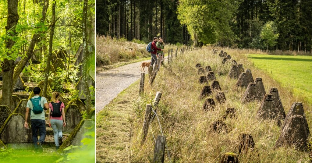 Immer wieder begegnet man sichtbaren Spuren der Vergangenheit: gesprengten Bunkern, alten Gräben und den charakteristischen Panzersperren. Infotafeln entlang der Strecke erklären, wie das System aufgebaut war und welche Rolle es im Krieg spielte.