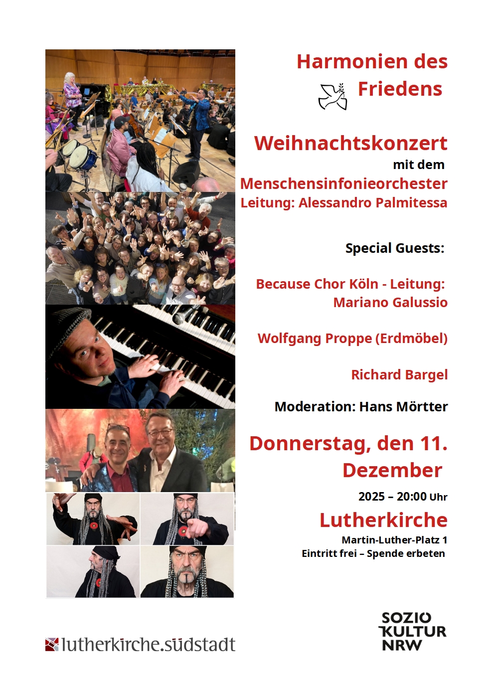 Das Menschensinfonieorchester, gegründet von Alessandro Palmitessa und Hans Mörtter, steht seit fast 25 Jahren für musikalische Inklusion und gelebte Gemeinschaft. Gemeinsam mit dem Because Chor Köln, Wolfgang Proppe (Erdmöbel) und Bluesmusiker Richard Bargel präsentiert das Orchester ein festliches Programm im Zeichen von Frieden, Zusammenhalt und Hoffnung.