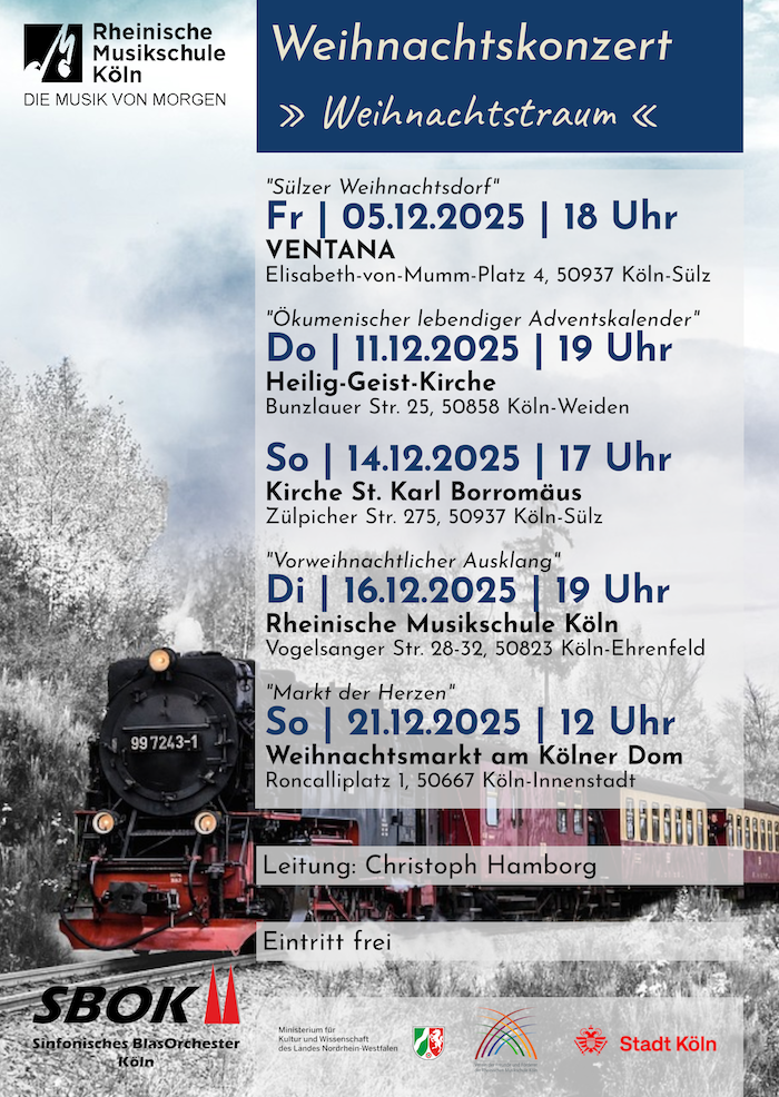 Das SBOK nimmt die Besucher*innen mit auf eine musikalische Reise mit fantasievollen Momenten, gregorianisch anmutenden Klängen, jazzigen Elementen und besinnlichen Harmonien – zum Träumen, Staunen und Mitsingen rund um die Weihnachtszeit. Auf dem Programm stehen Werke wie „An English Christmas“ von Philip Spark, „Sleigh Ride“ von Mitchell Paris/Leroy Anderson und „Hänsel und Gretel“ von Engelbert Humperdinck. Der Eintritt zu allen Konzerten ist frei!