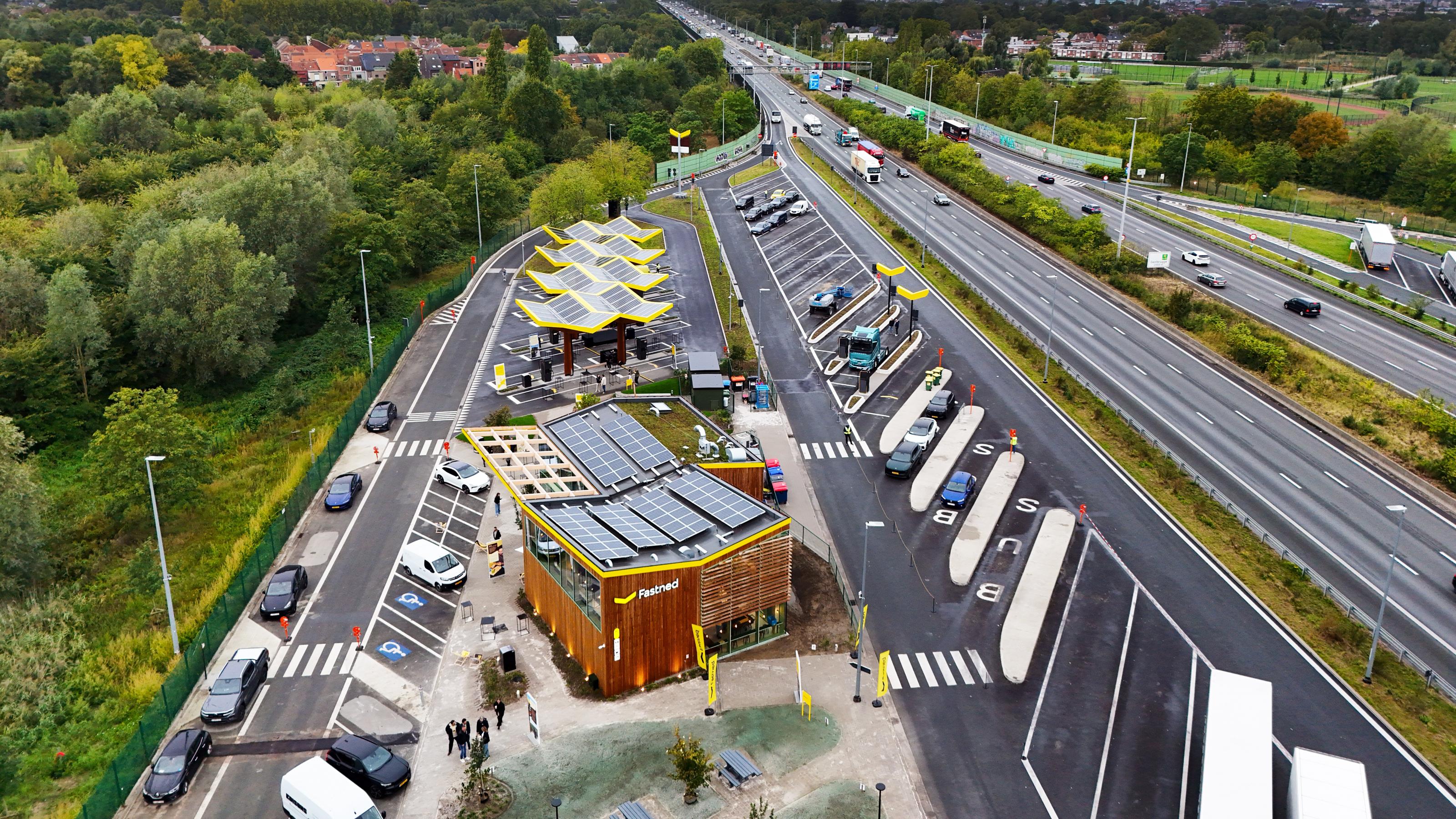 An der E17 zwischen Gent und Antwerpen ist die Zukunft schon da: Die Raststätte Gentbrügge bietet 16 Schnellladepunkte für E-Autos und vier weitere für Elektro-Lkw. Auf dem Dach entsteht Solarstrom, im Shop wachsen Bäume bis ins Holzdach.
