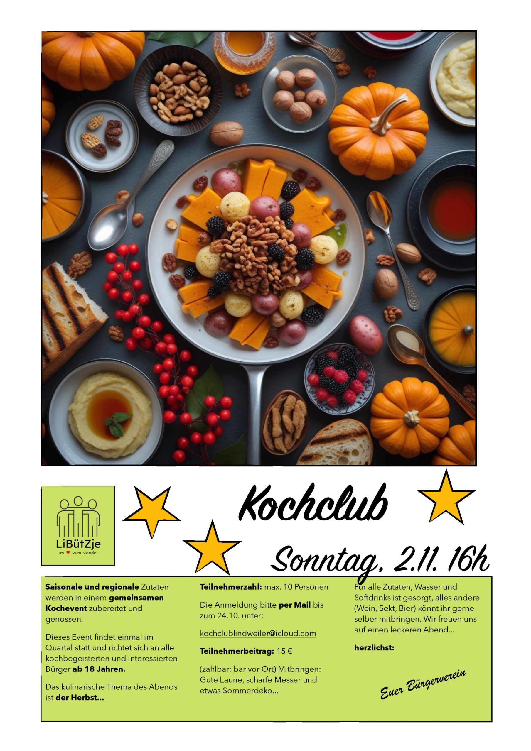 Der Kochclub des Bürgervereins lädt alle kochbegeisterten Bürgerinnen und Bürger zu einem besonderen herbstlichen Kochevent ein. Gemeinsam werden saisonale und regionale Zutaten verarbeitet und im geselligen Rahmen genossen.