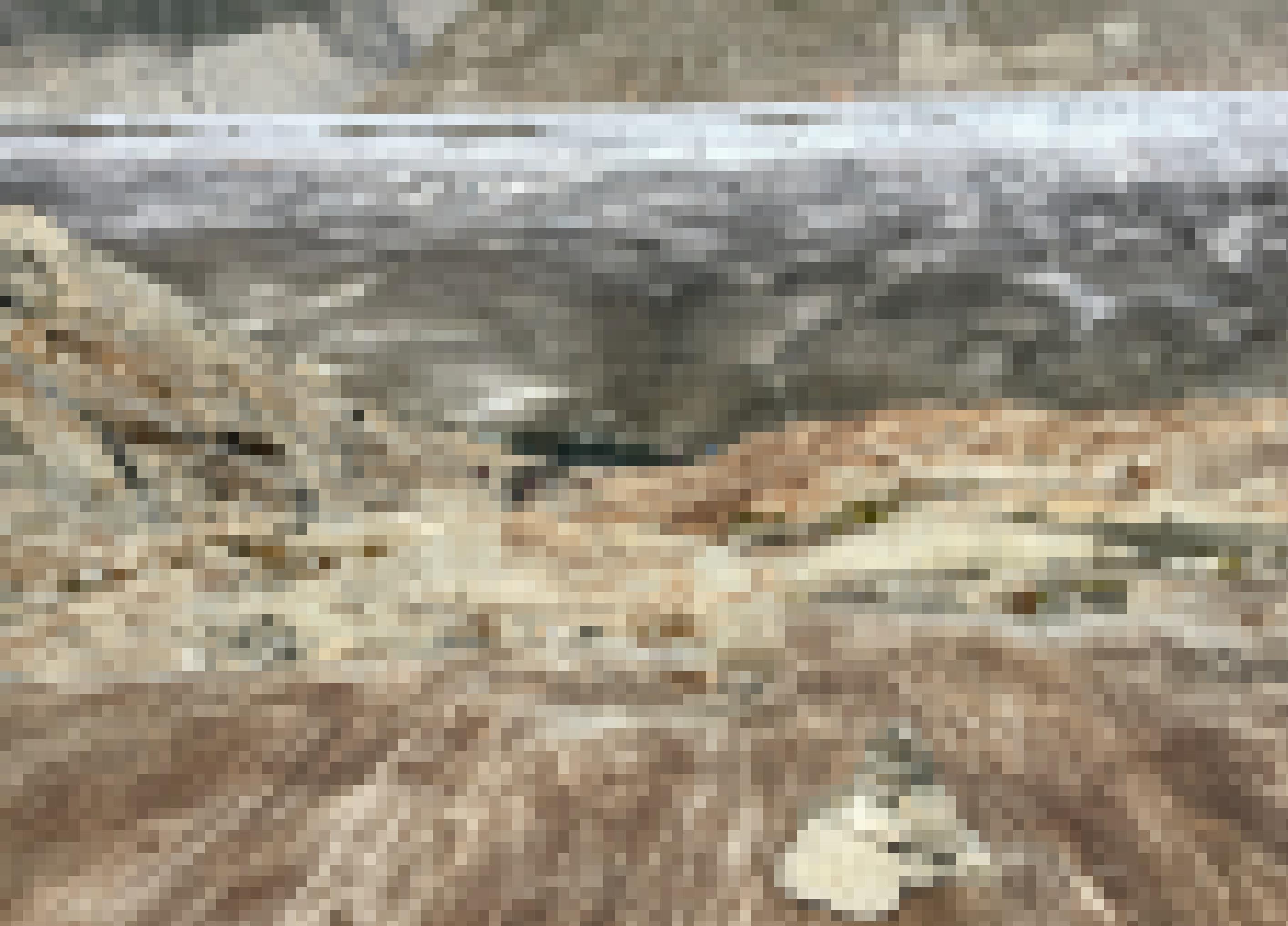 Die Landschaft hat blank gezogen, liegt nackt und schrundig da, aper, also ohne jeden Schnee. Richtung Gletscherzunge ist das schwarze Matterhorn zu sehen, vor uns graue Felsflanken, schottriger Aaregranit, nichts Grünes, nichts Mildes. Im Hintergrund Eiger, Mönch und Jungfrau. Die einzige Farbe sind die bunte Outdoorklamotten der Gletscherfans und darüber der gnadenlos blaue Sommerhimmel.
