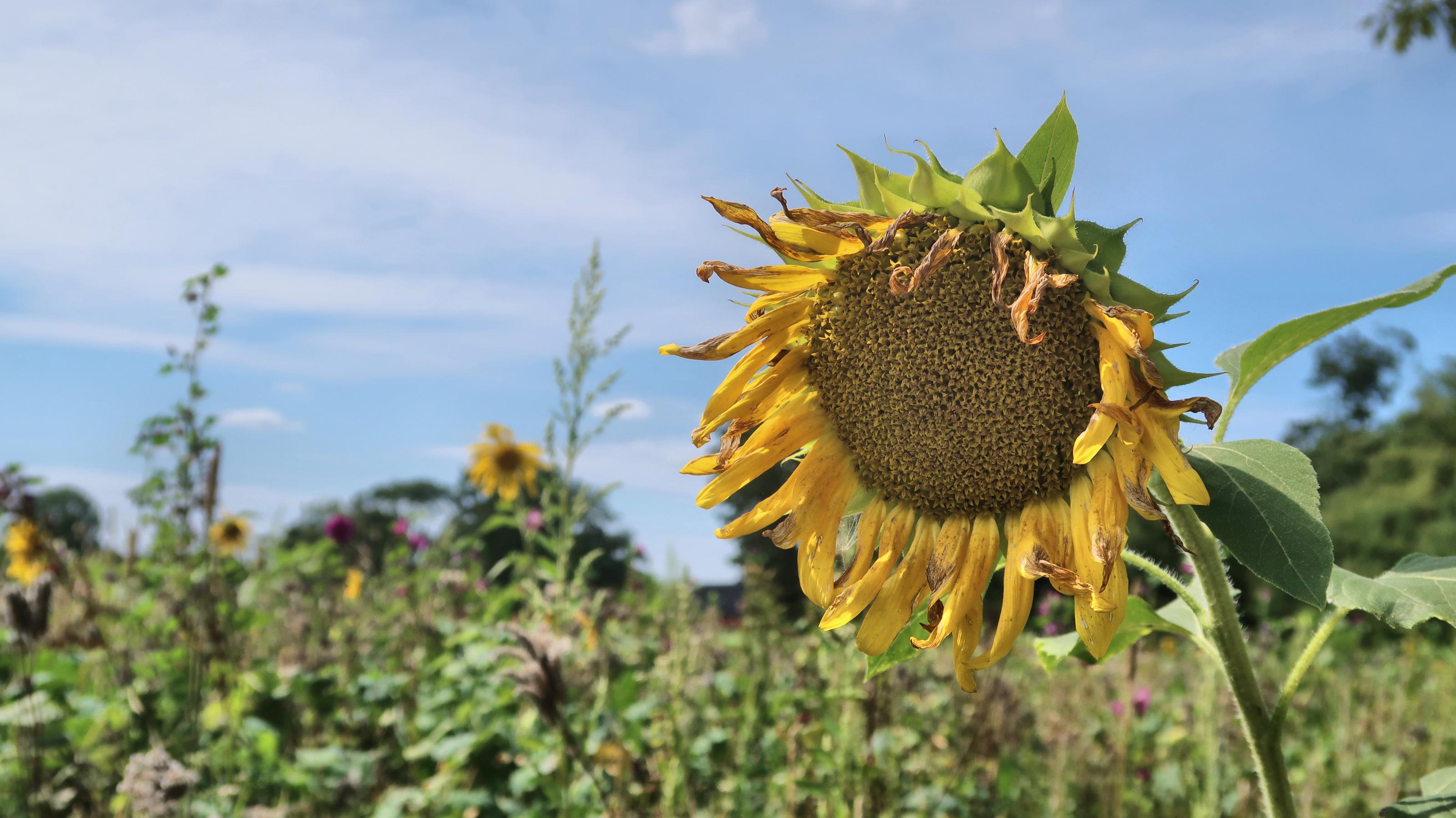 Ein Sonnenblumenfeld im Brandenburger Hochsommer. Die Sonne brennt, die Erde ist staubig. Traurig hängen die Pflanzenköpfe herunter, weit und breit keine Wolke in Sicht. Kurz schaut eine Hornisse vorbei, doch selbst die dreht schnell wieder ab. Nur eine Momentaufnahme? Leider nicht.